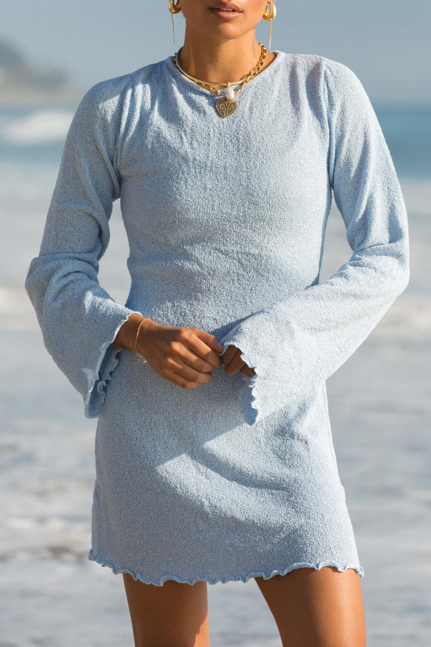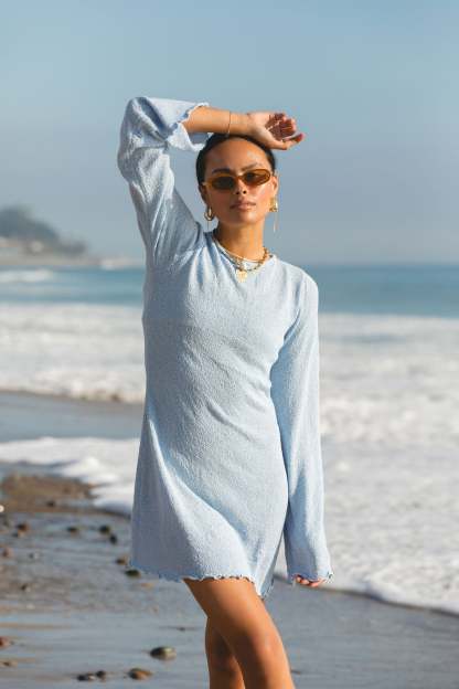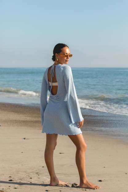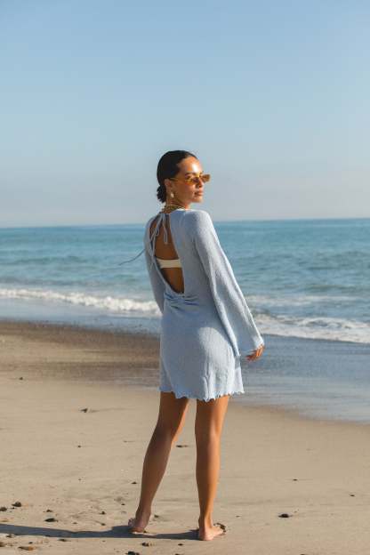 Transition seamlessly from the beach to dinner in our High Seas Long Sleeve Mini Dress. The soft knit fabric and ruffle-trimmed details give this dress a feminine touch, while the high neck and open tie back add a touch of sophistication. Perfect for any occasion, this dress is a must-have for your summer wardrobe.