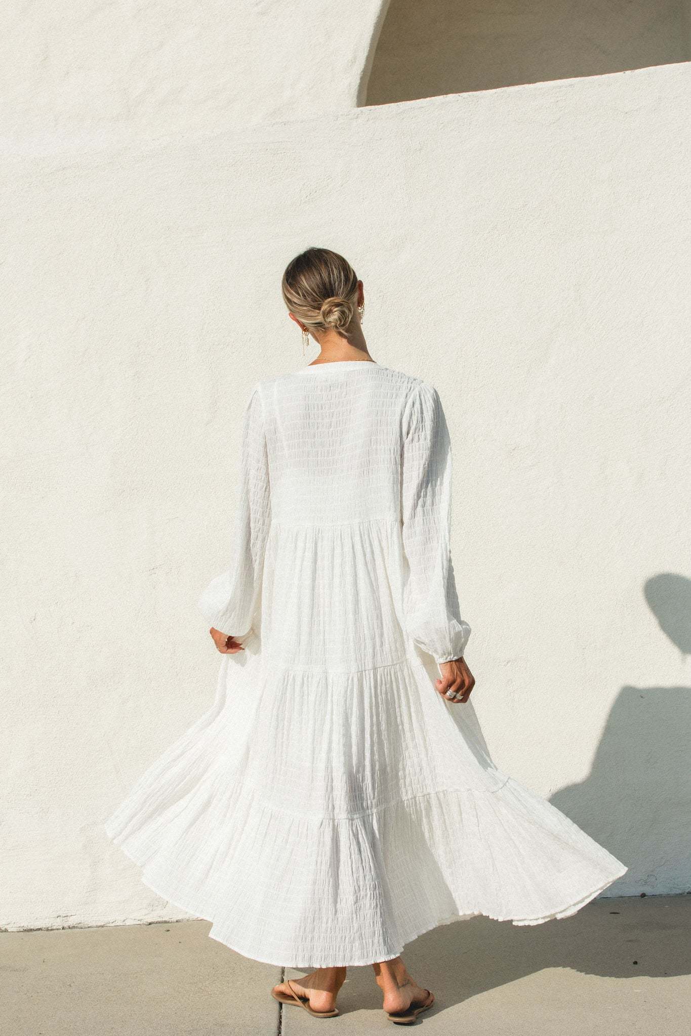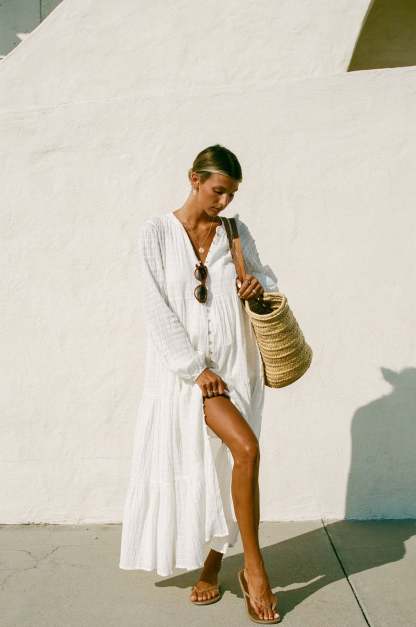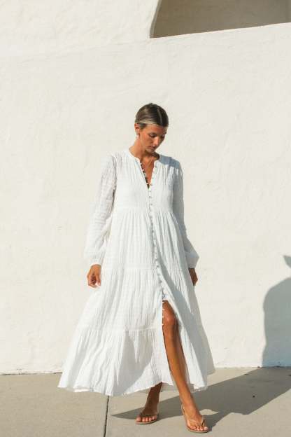 Introducing the Shores Button Maxi Dress, perfect for a coastal charm look. With its textured fabric and functional button-down design, this versatile dress effortlessly transitions from day to night. The included slip ensures a chic, comfortable look for any season.