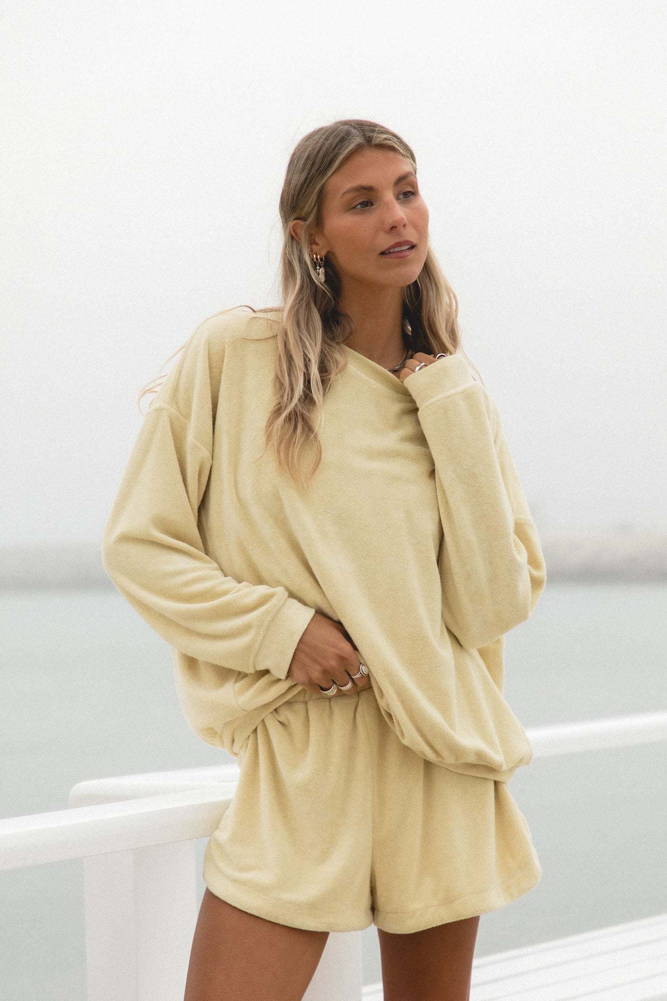 Introducing Surfrider Towel Shorts, the perfect addition to your beach wardrobe. made to be worn after a cool ocean dip, or as a causal everyday look. These versatile shorts can be worn alone or paired with the Surfrider Towel Oversized Pullover for a complete look. With a subtle scoop and side slit, these shorts offer a flattering fit.?