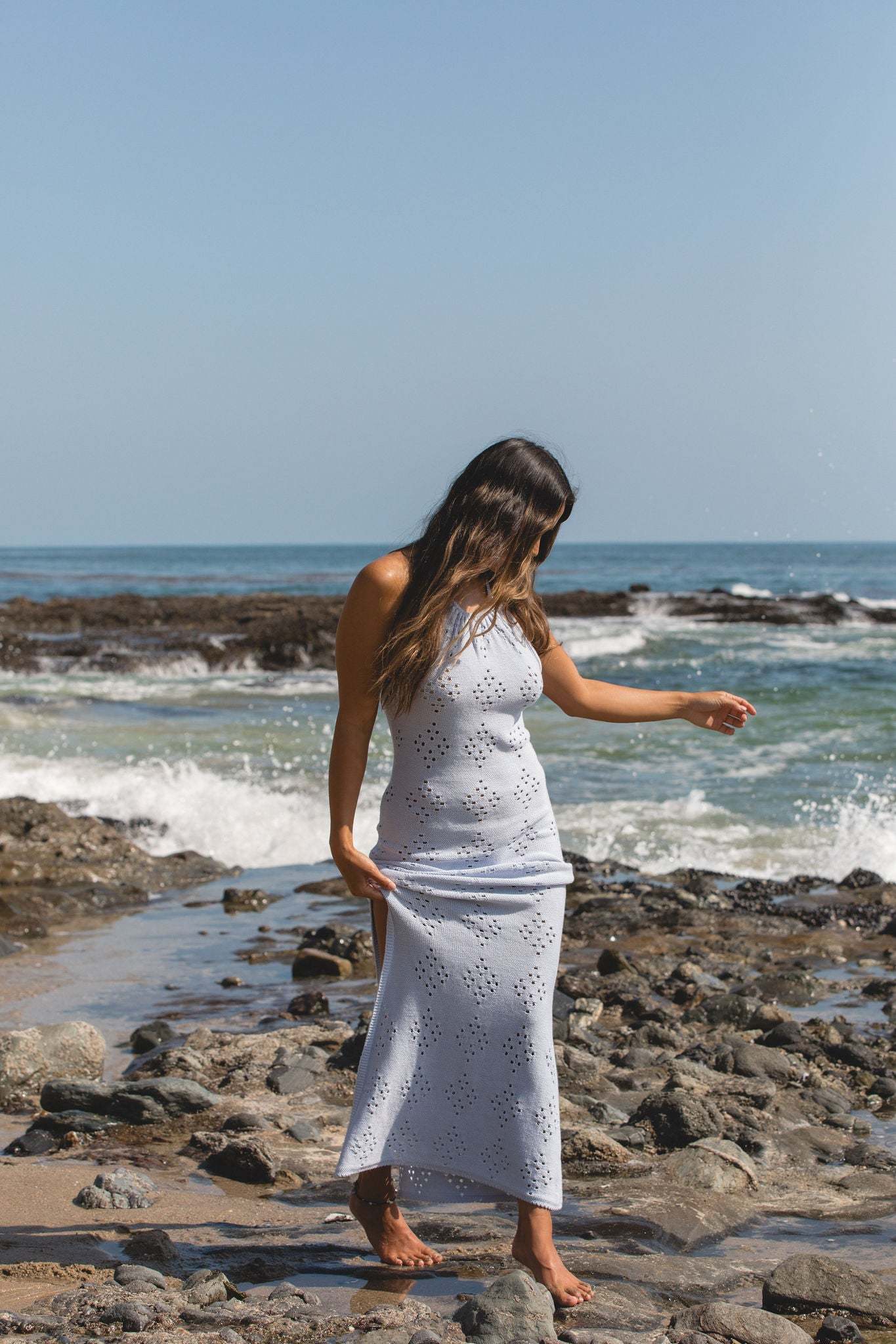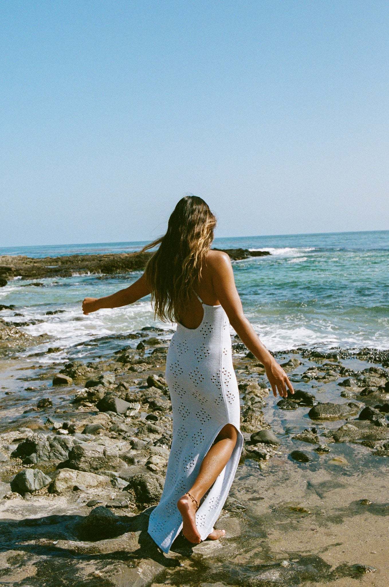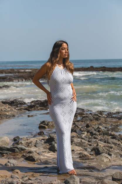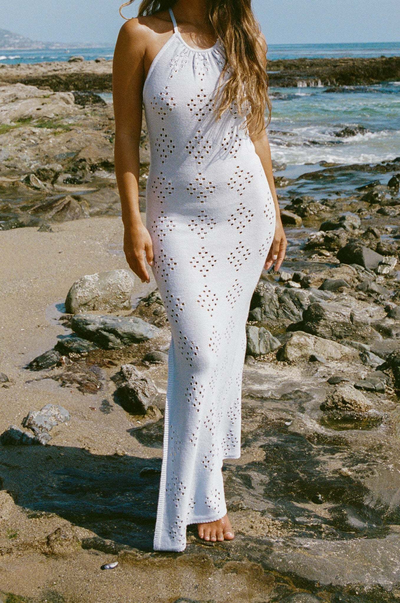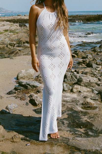 Discover effortless elegance with the Sweet Tides Knit Halter Dress. This maxi dress features a fitted silhouette and open knit fabric, creating a flattering and comfortable look.