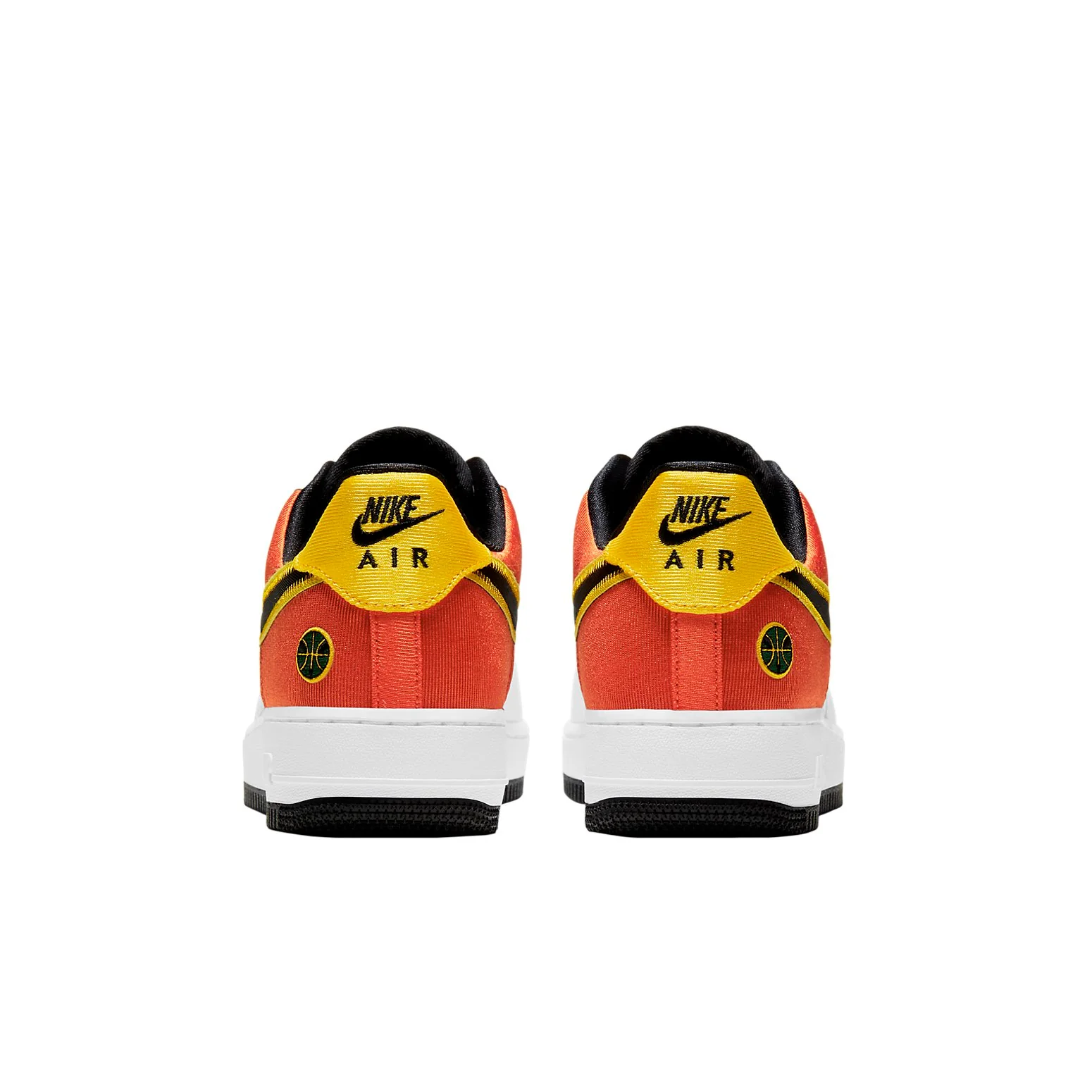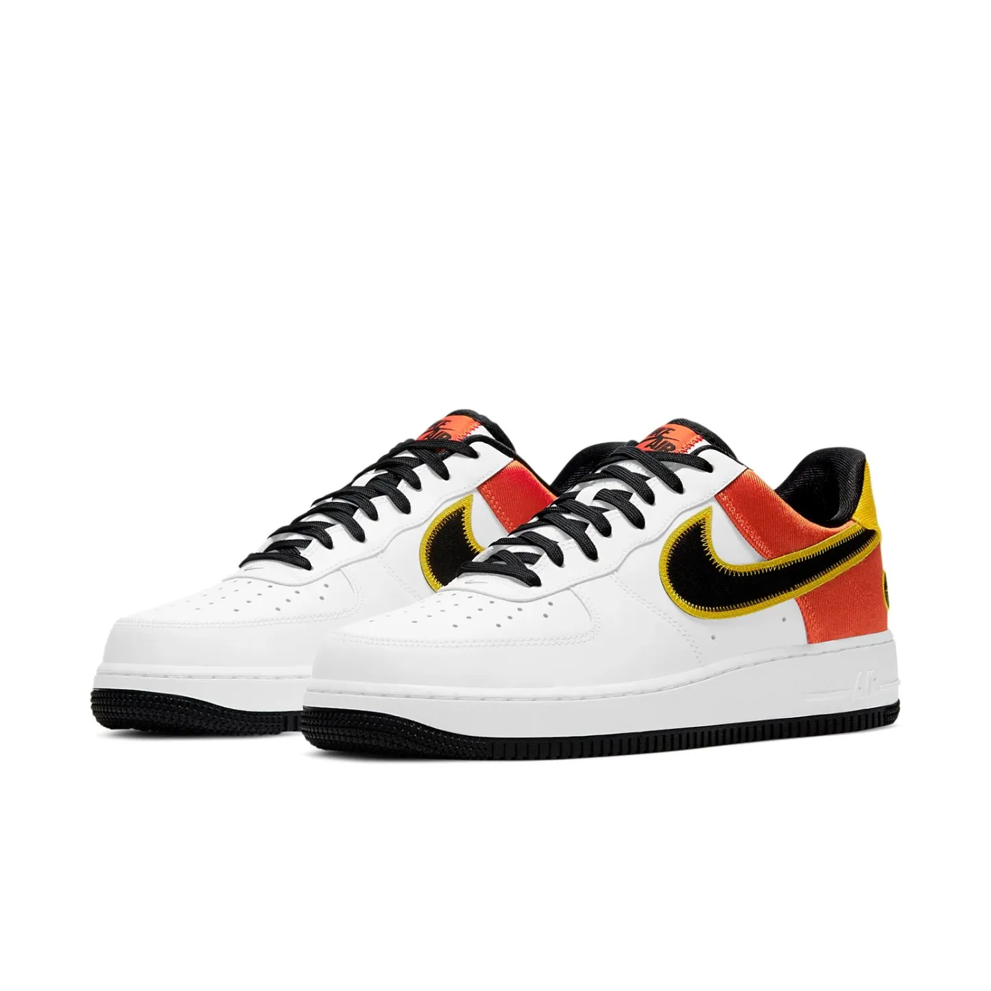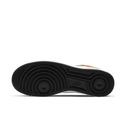 This Air Force 1 Low is dressed in a White, Black, Amarillo, and Orange Flash color combination. It highlights a premium white leather upper accented by black Swooshes framed by yellow and exposed stitching and yellow and orange panels that add brightness to the shoes. An alien face basketball badge on the lateral ankle with the 鈥淩ayguns鈥?logo on the left insole finishes the design.